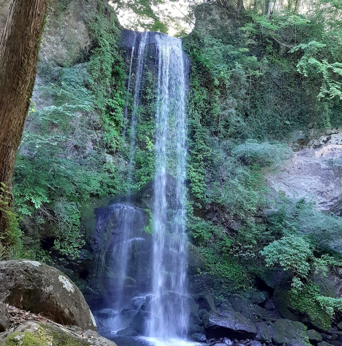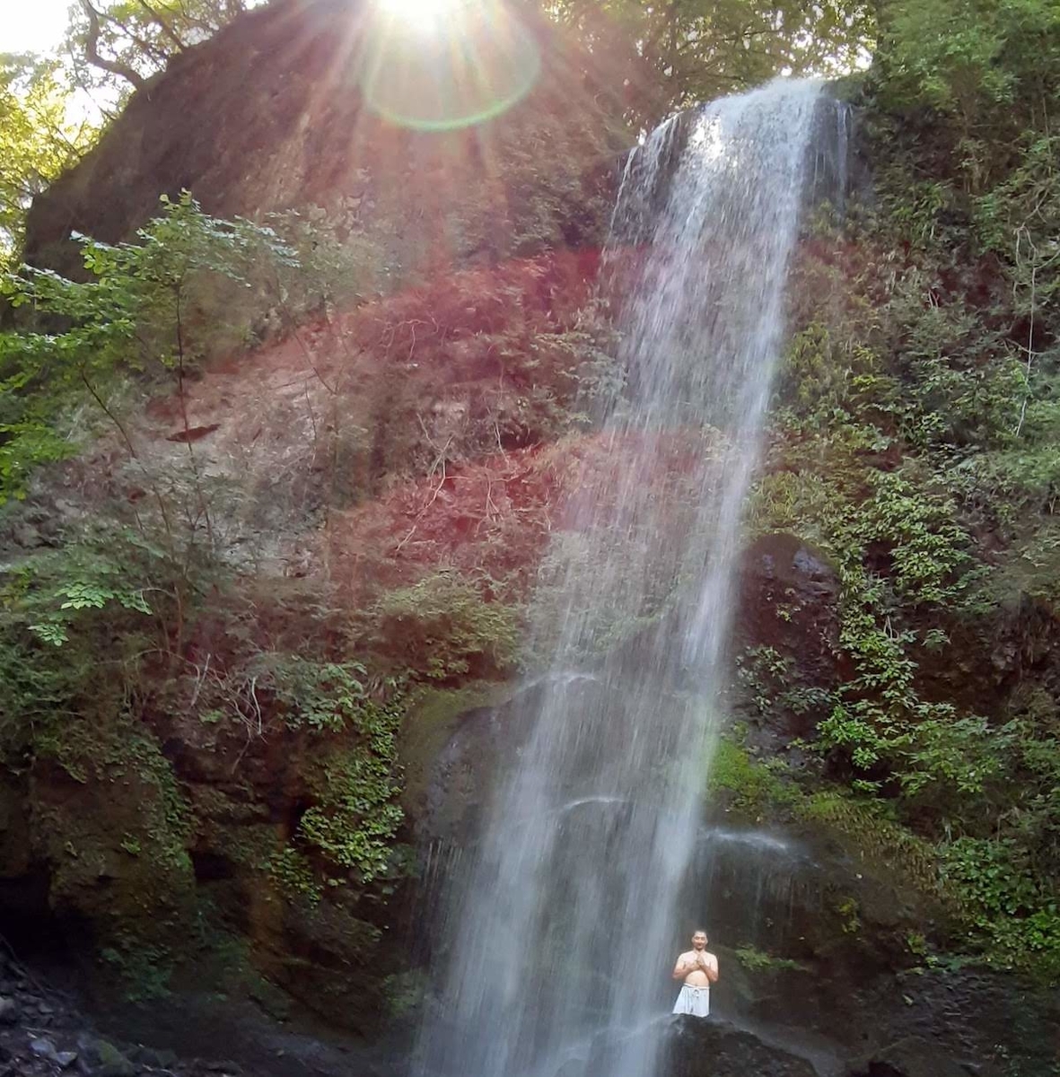 集合場所の駐車場で、空手着に着替え、300メートルほどの整備された山道を歩いて滝に着くと汗をかくぐらい天気の良い日でした。