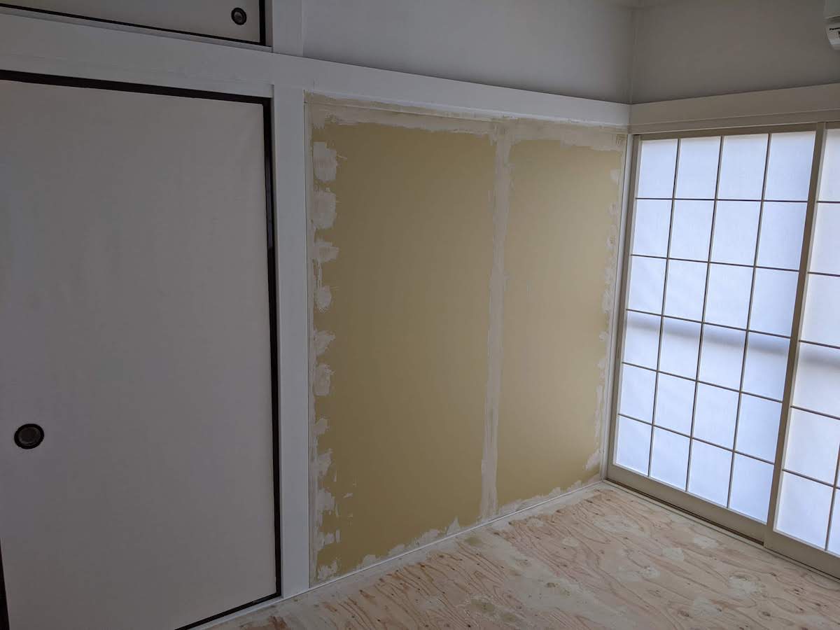 先日、カットして固定した壁にパテ埋めします。