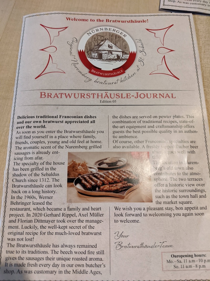 ニュルンベルクに来た一番の目的は、ブラートヴルストホイスレで、ニュルンベルガーソーセージを食べることです!